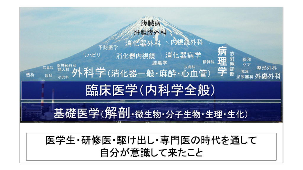 若い医師に向けての講演で使ったスライドを図に示します。スライドにある臨床医学=内科学については2019/7/5のブログを参照ください。