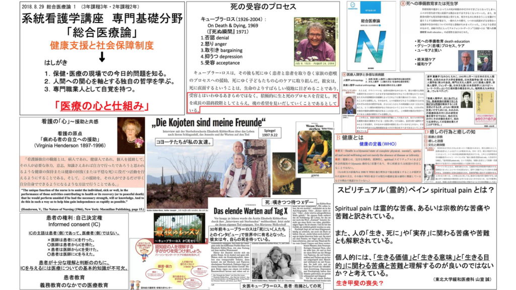 図.講義プリントの抜粋(茨城県立中央看護専門学校「総合医療論」第1回の最後の授業。教科書は医学書院「総合医療論」2018を使用。自分の資料を適宜追加。スピリチュアル・ペインのスライドは10年間使い続けた)。