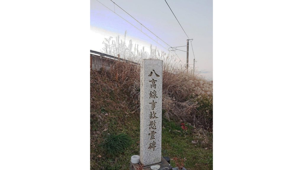 図1.八高線列車転覆事故の現場。高麗川駅方面を望む。築堤の上の線路は左にカーブしている。現在の慰霊碑は1980年2月25日建立。2023年1月撮影。