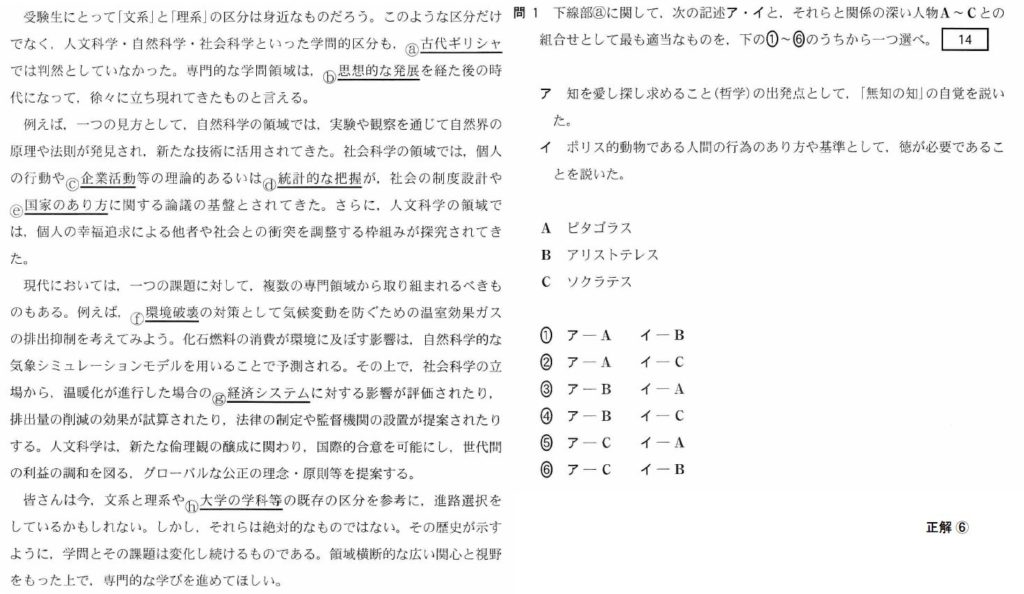 例えば問1(図上右)。文章のほんの一部に出てくる言葉(「古代ギリシャ」)から「古代ギリシャの哲学者とその説くところはどれか」というのです。受験の理系と文系の話とは無関係です。単なる暗記ものです。