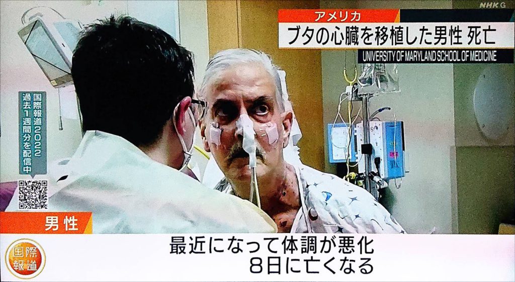 遺伝子改変ブタの心臓の移植を受けたアメリカの男性が亡くなりました(図は2022/3/10夜のNHKニュースから)。術後2カ月ほどのことでした。期待をしていただけに残念です。彼の死が無駄にならず、医学の新たな進歩に繋がることを願ってやみません。