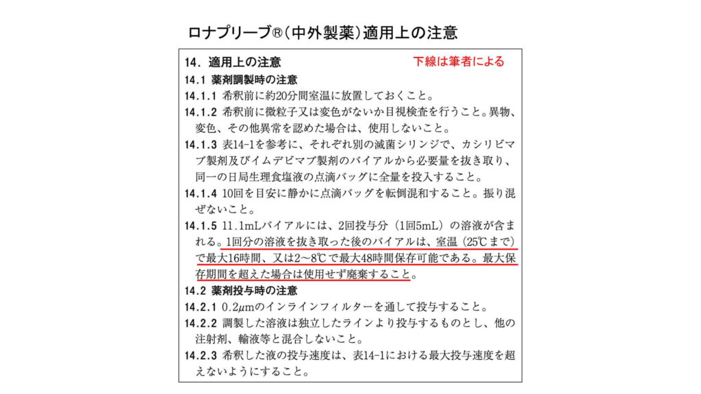 ほかにも問題があります。なぜかは分かりませんが、発注して届く抗体カクテルは点滴静注セット1332のみで、1セット2人分になっているのです。1人分を使うともう1人分は低温保存でも48時間以内に使わなければなりません。「最大保存期間を超えた場合は使用せず破棄すること」(図参照)となっています。