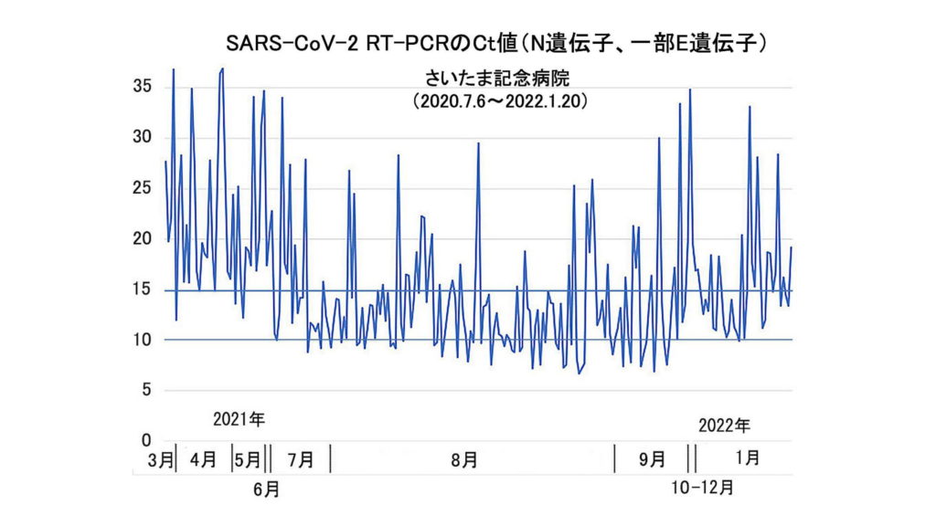 変異株が分かるようになった2021年4月からのCt値をN遺伝子でみた結果も図2に示されています。N遺伝子の検査がなくE遺伝子で見ていた場合は、E遺伝子のCtを示しています(例えば20.2(E)と表記)。
