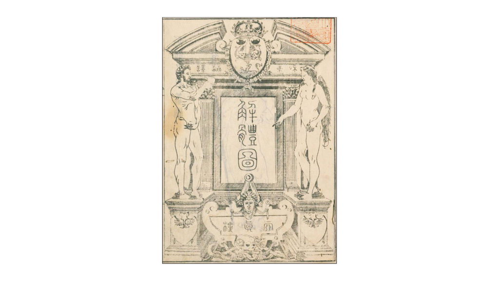 図1.解体新書の表紙(国立国会図書館蔵)。絵は小田野直武によるが、ターヘル・アナトミアの表紙ではなく、ワルエルダ解剖書(スペイン語原本1556、蘭語翻訳1568/1614)の表紙を参考にしている。